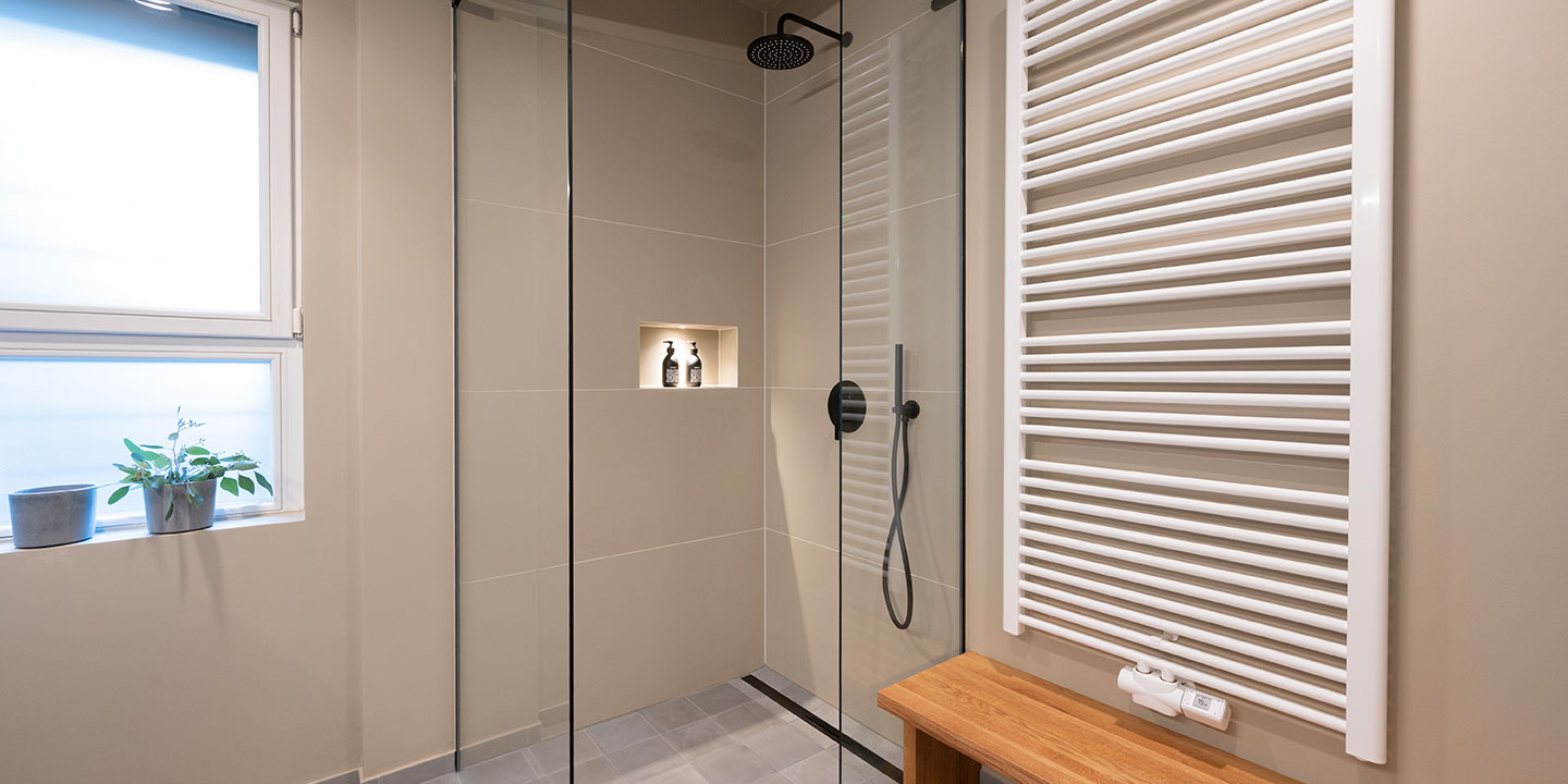 Die Neuordnung des Grundrisses sowie die Erweiterung auf knapp 10 qm ermöglichen eine klare Zonierung und verbesserte Bewegungsabläufe. Die Sanitärobjekte wurden neu positioniert und gestalterisch harmonisch in das Gesamtkonzept integriert.