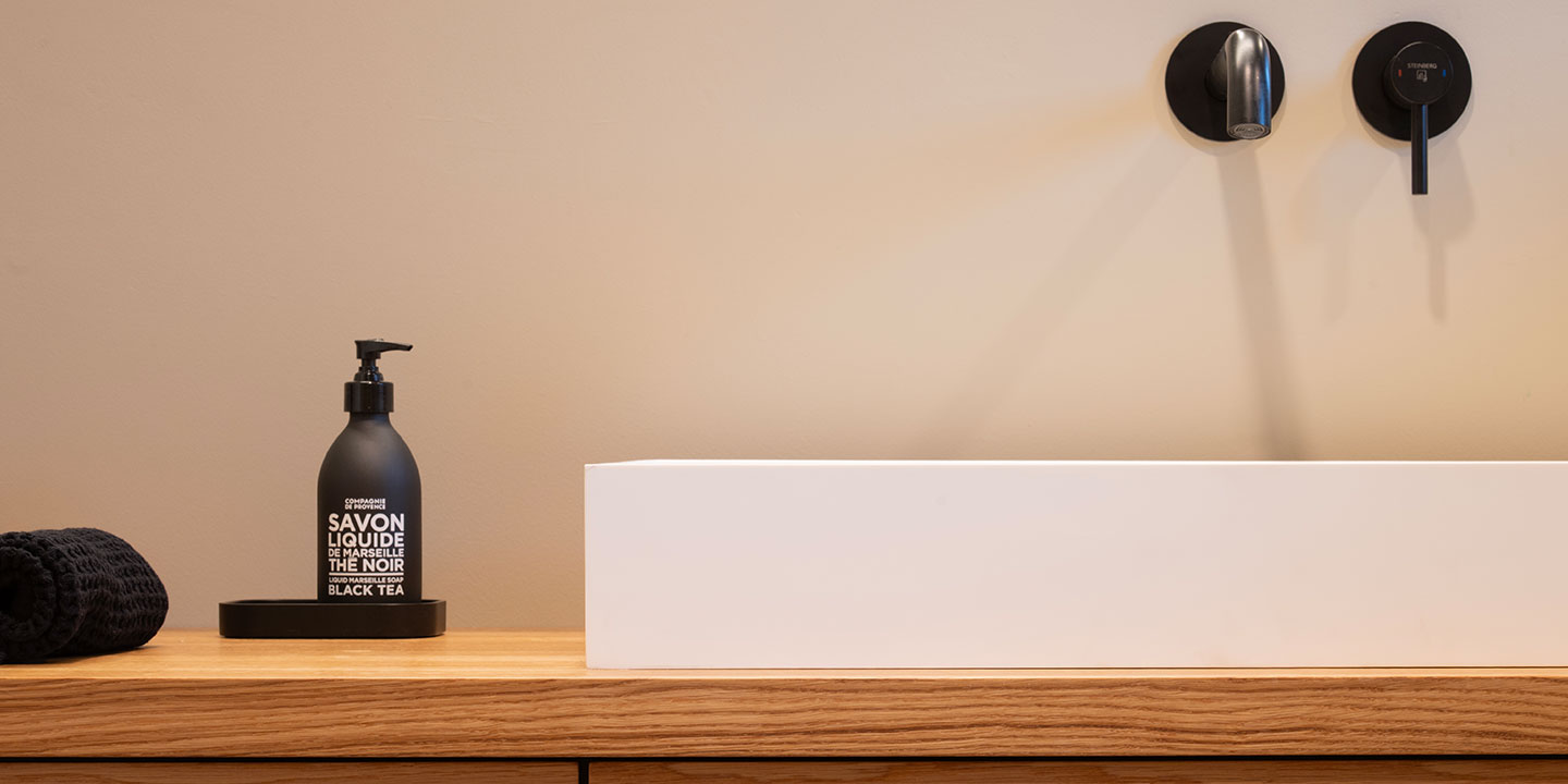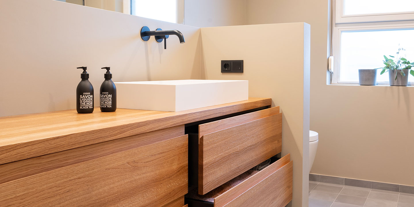 Die Kombination aus reduzierter Gestaltung und sorgfältig ausgesuchter Materialien – massives Eichenholz für den Waschtisch und die Sitzbank, lackiertes MDF für die Schrankeinbauten, Feinsteinzeug - Fliesen, sowie ein hochbeständiger Anstrich der Wände und Decke – schafft eine warme und wohnliche Atmosphäre.
