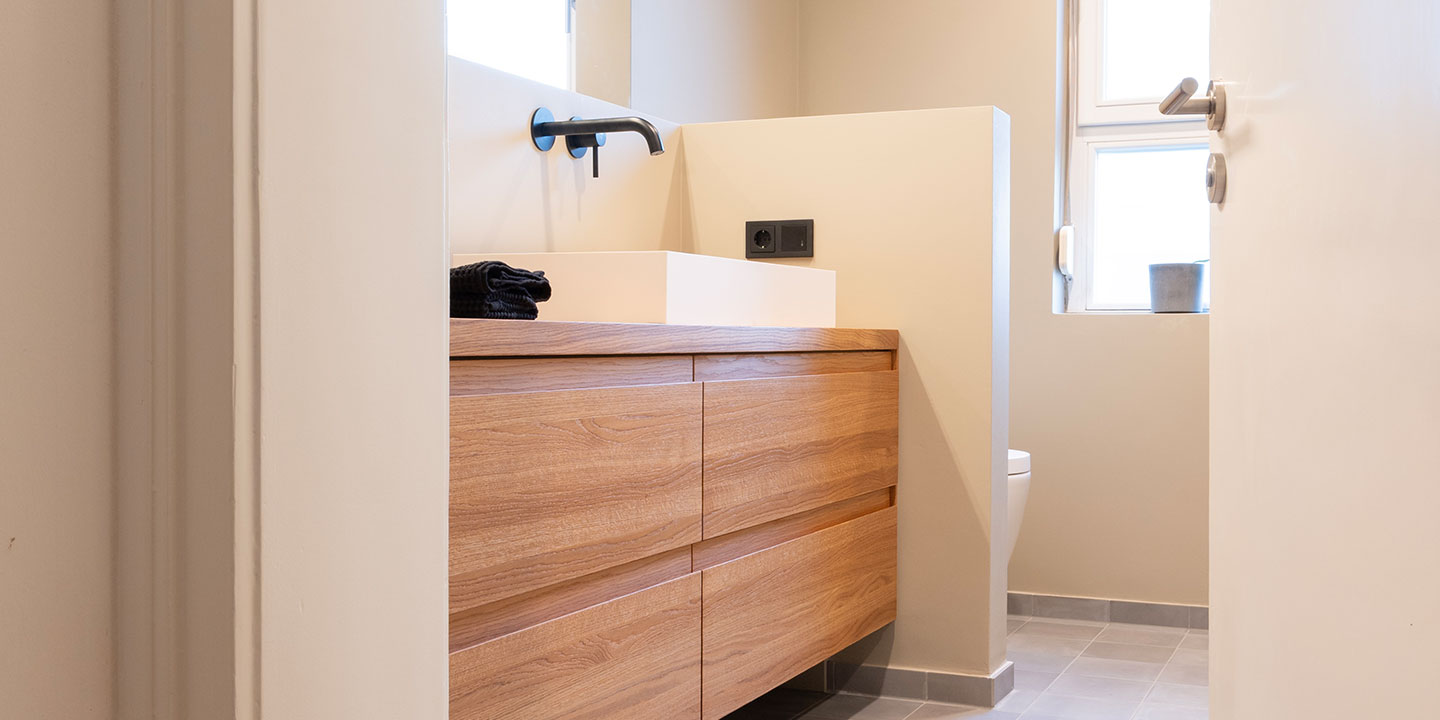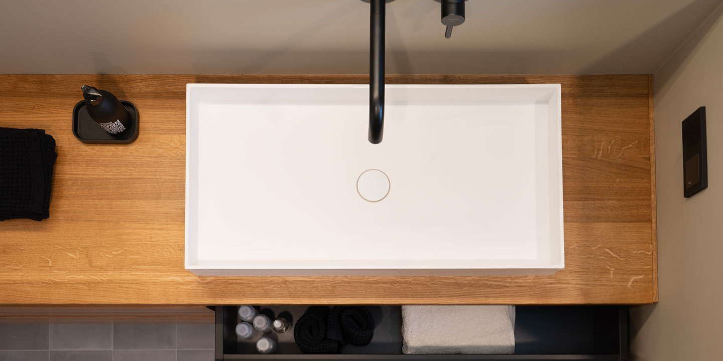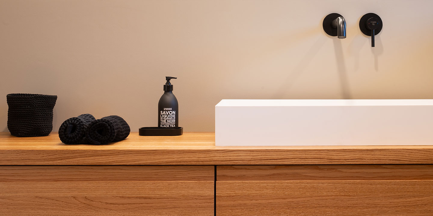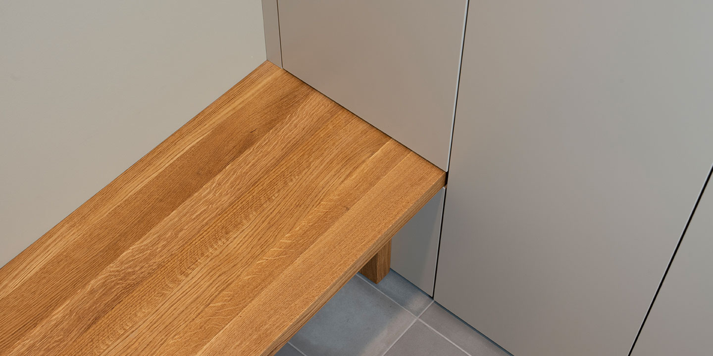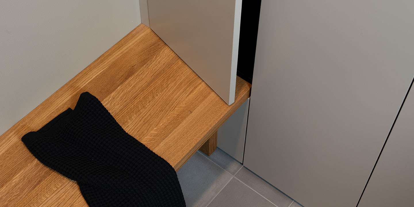 Die Kombination aus reduzierter Gestaltung und sorgfältig ausgesuchter Materialien – massives Eichenholz für den Waschtisch und die Sitzbank, lackiertes MDF für die Schrankeinbauten, Feinsteinzeug - Fliesen, sowie ein hochbeständiger Anstrich der Wände und Decke – schafft eine warme und wohnliche Atmosphäre.