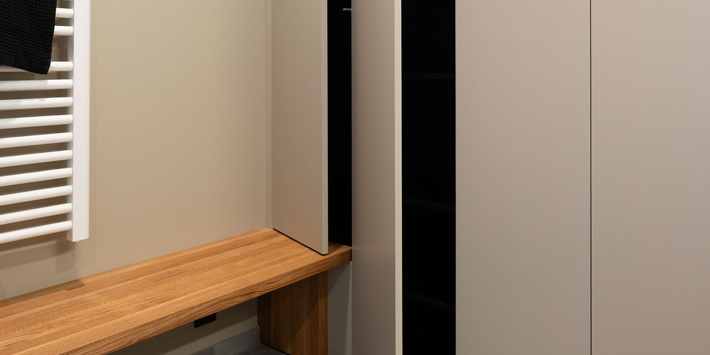 Neue Stauräume sind unauffällig hinter geschlossenen Flächen untergebracht und optimal platziert. So wirkt das Bad immer aufgeräumt. Durch die einheitliche, durchgängige Farbgebung der Fliesen, Wänden, Decke und Schrankeinbauten entsteht eine Optik, die den Raum harmonisch und großzügiger wirken lässt.